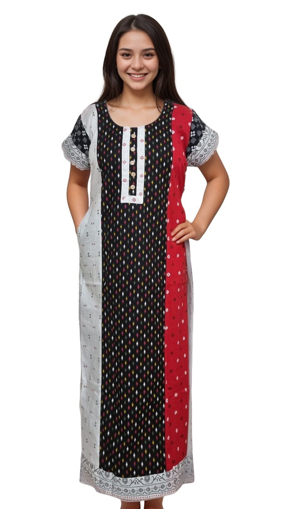 This A-line nighty for women features a flattering free-size fit that comfortably suits up to a 48-inch bust, making it perfect for everyday wear. The design showcases a stunning blend of ethnic-inspired prints, contrasting vertical panels, and delicate motifs, giving it a rich yet graceful look. The stylish front placket with decorative buttons enhances its designer appeal, while the round neckline and half sleeves ensure relaxed ease.