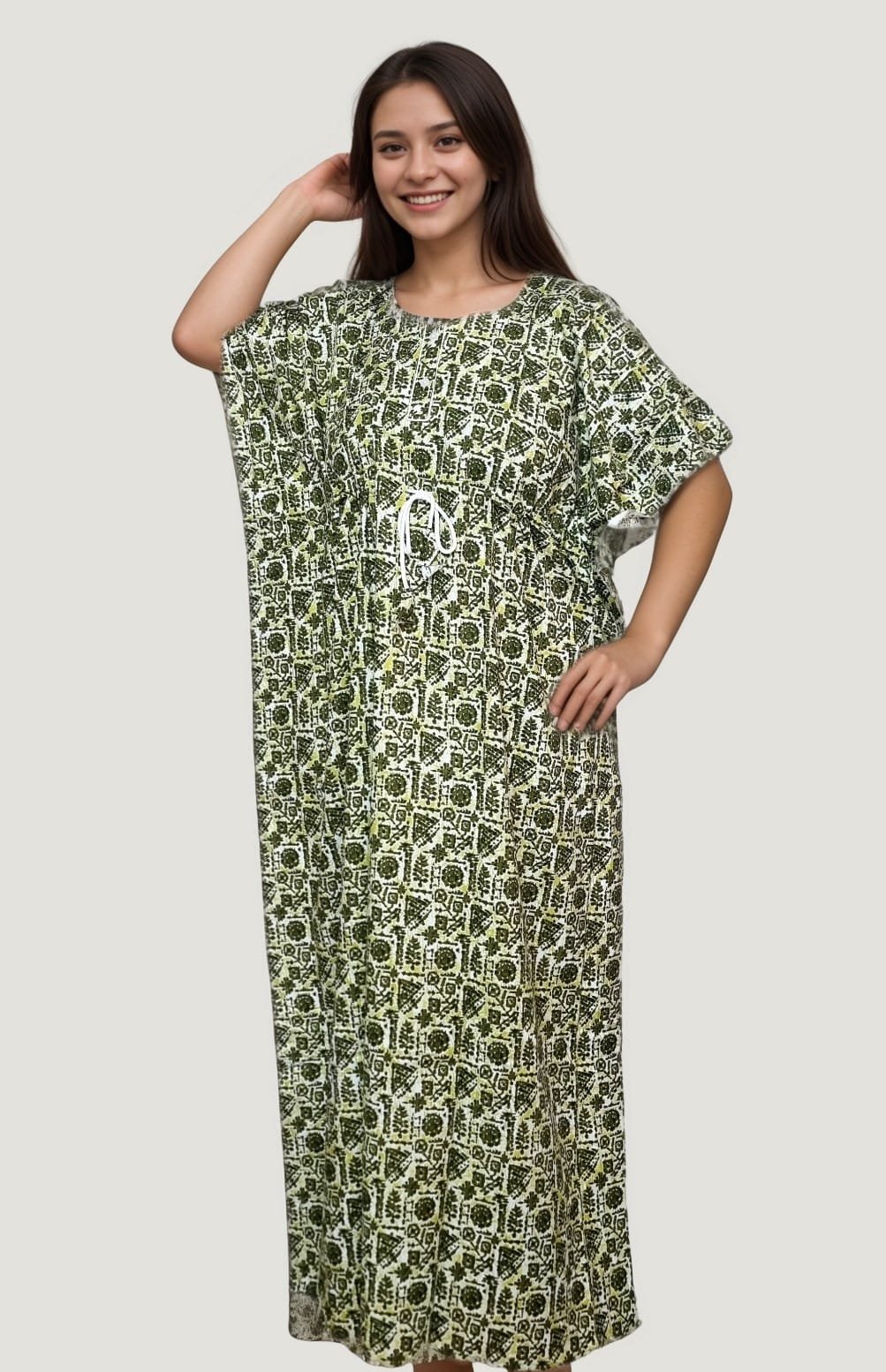The design stands out with beautiful batik print–inspired ethnic motifs, highlighted by contrast borders and traditional geometric patterns. The stylish neckline with adjustable drawstring detailing adds a functional yet decorative touch, enhancing comfort and fit. Wide sleeves and a loose structure make this kaftan perfect for sleeping, lounging, maternity wear, or relaxed daytime wear.