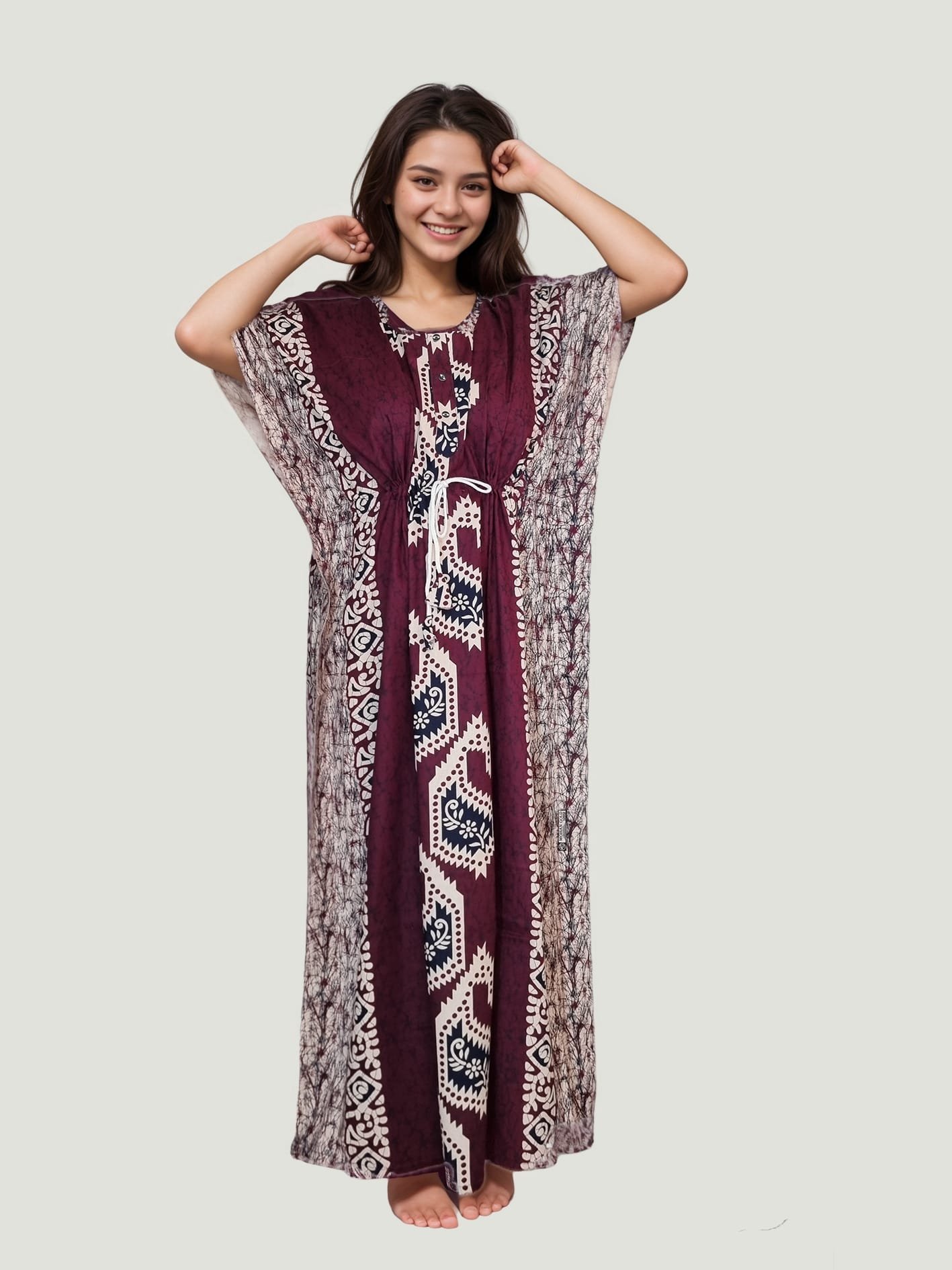 The design stands out with beautiful batik printāinspired ethnic motifs, highlighted by contrast borders and traditional geometric patterns. The stylish neckline with adjustable drawstring detailing adds a functional yet decorative touch, enhancing comfort and fit. Wide sleeves and a loose structure make this kaftan perfect for sleeping, lounging, maternity wear, or relaxed daytime wear.