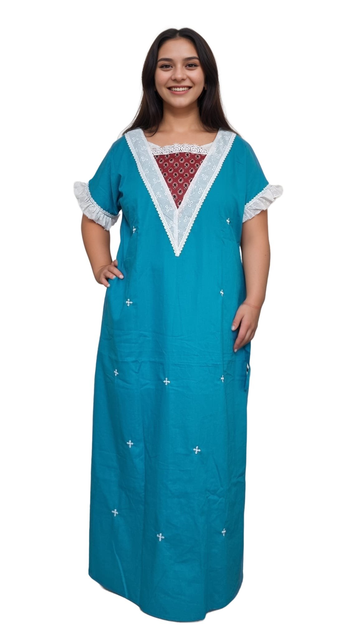 Be the first to review “Light Blue Lace Neck A-Line Designer Cotton Nighty”