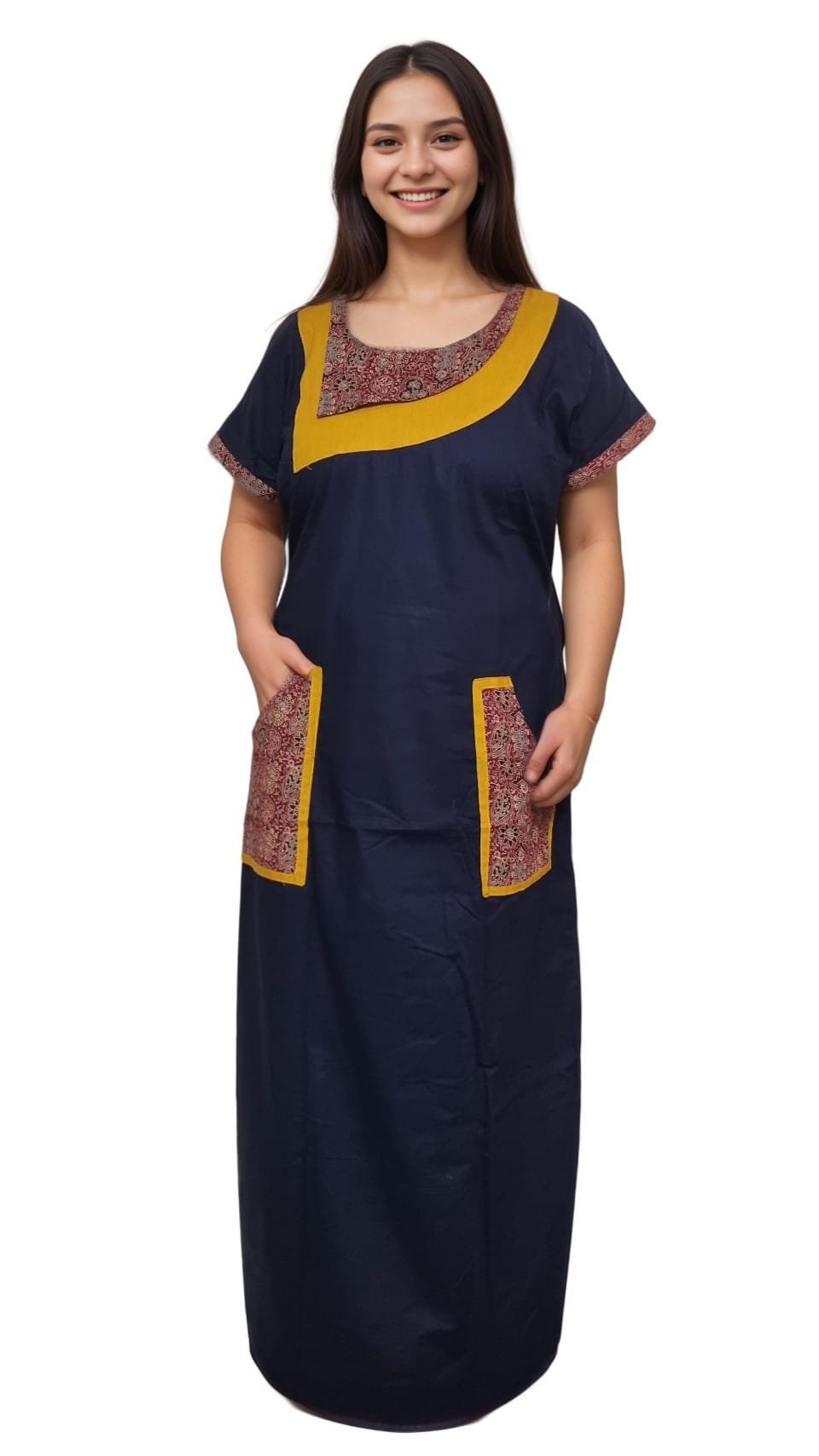 Made for versatility, this ladies nighty cotton design includes stylish cotton nighty with pockets, adding functionality to fashion. The breathable fabric ensures it remains a comfortable cotton sleepwear for women, perfect for sleeping, lounging, maternity wear, or daily home use. The elegant printed panels make it a standout printed cotton nighty and a popular choice in womenās cotton nightwear across Cotton nighty India collections.