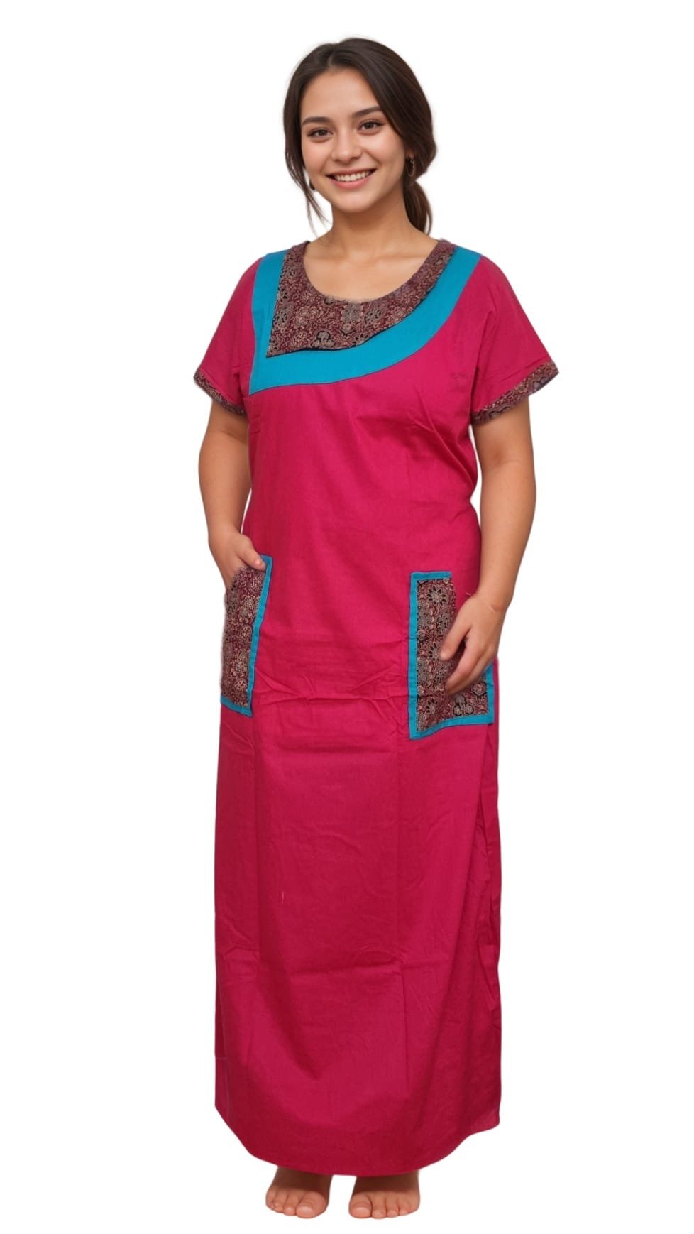 Made for versatility, this ladies nighty cotton design includes stylish cotton nighty with pockets, adding functionality to fashion. The breathable fabric ensures it remains a comfortable cotton sleepwear for women, perfect for sleeping, lounging, maternity wear, or daily home use. The elegant printed panels make it a standout printed cotton nighty and a popular choice in womenās cotton nightwear across Cotton nighty India collections.