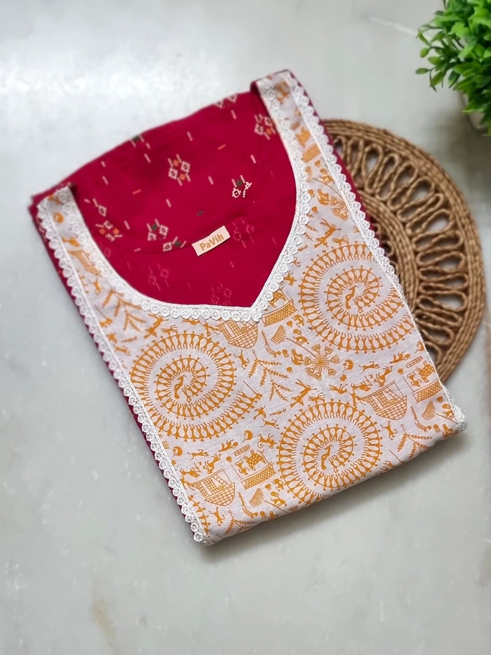 This printed cotton nighty features a beautiful ethnic-inspired design with a contrasting central panel that adds a refined traditional touch. The A-line silhouette enhances comfort while offering a flattering fit for all body types. With a free size fit and 48-inch bust, it ensures ease of movement and all-day relaxation. The round neck and half sleeves are finished with delicate lace detailing, elevating the overall look into a truly premium cotton nightwear India style.