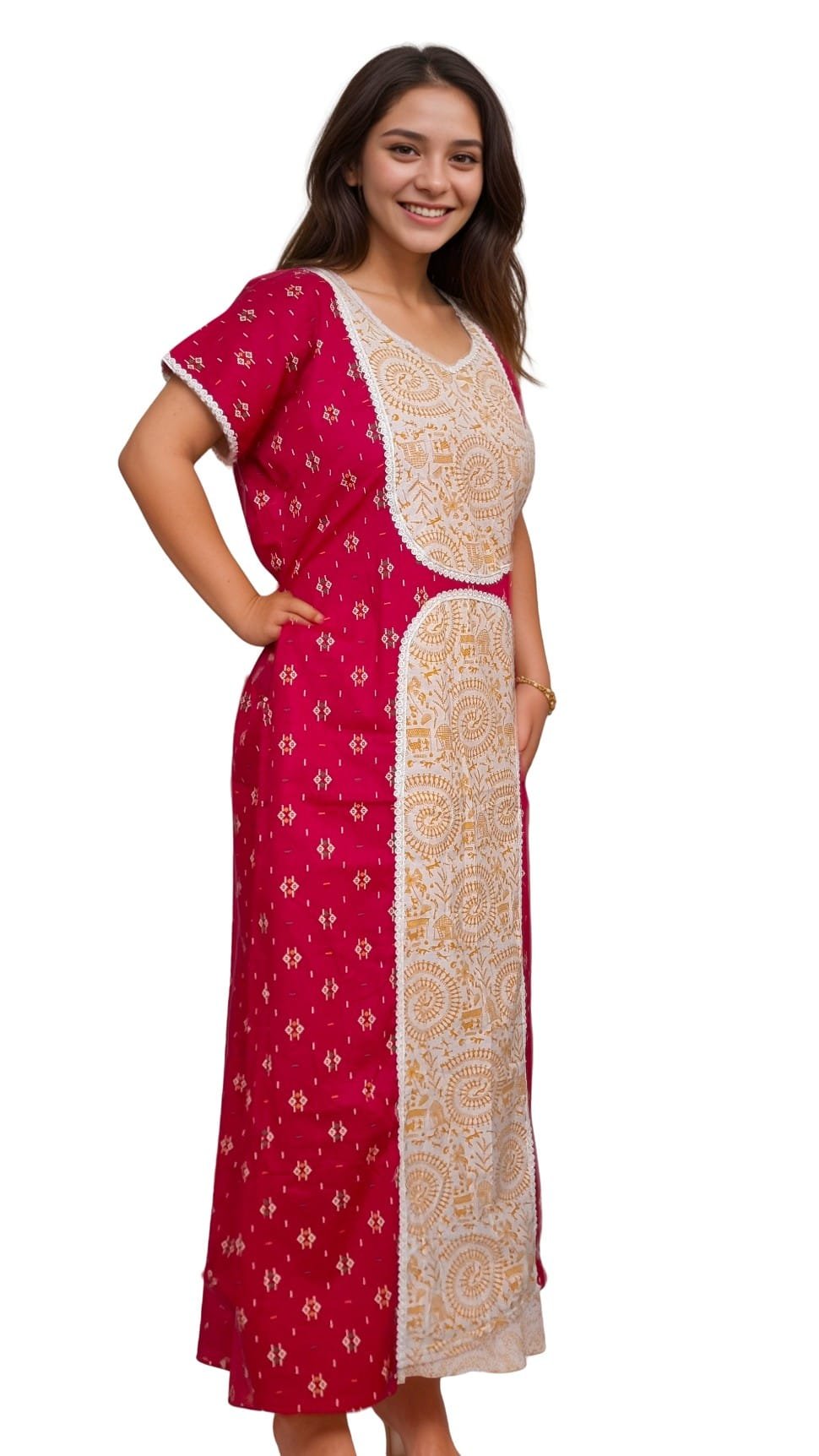 Product Description: Experience everyday comfort with timeless elegance in this designer cotton nighty for women, thoughtfully crafted from 100% pure cotton. Designed for Indian weather, this breathable cotton nighty keeps you cool, soft, and relaxed, making it ideal as a cotton night gown for daily wear, sleepwear, or comfortable loungewear at home.