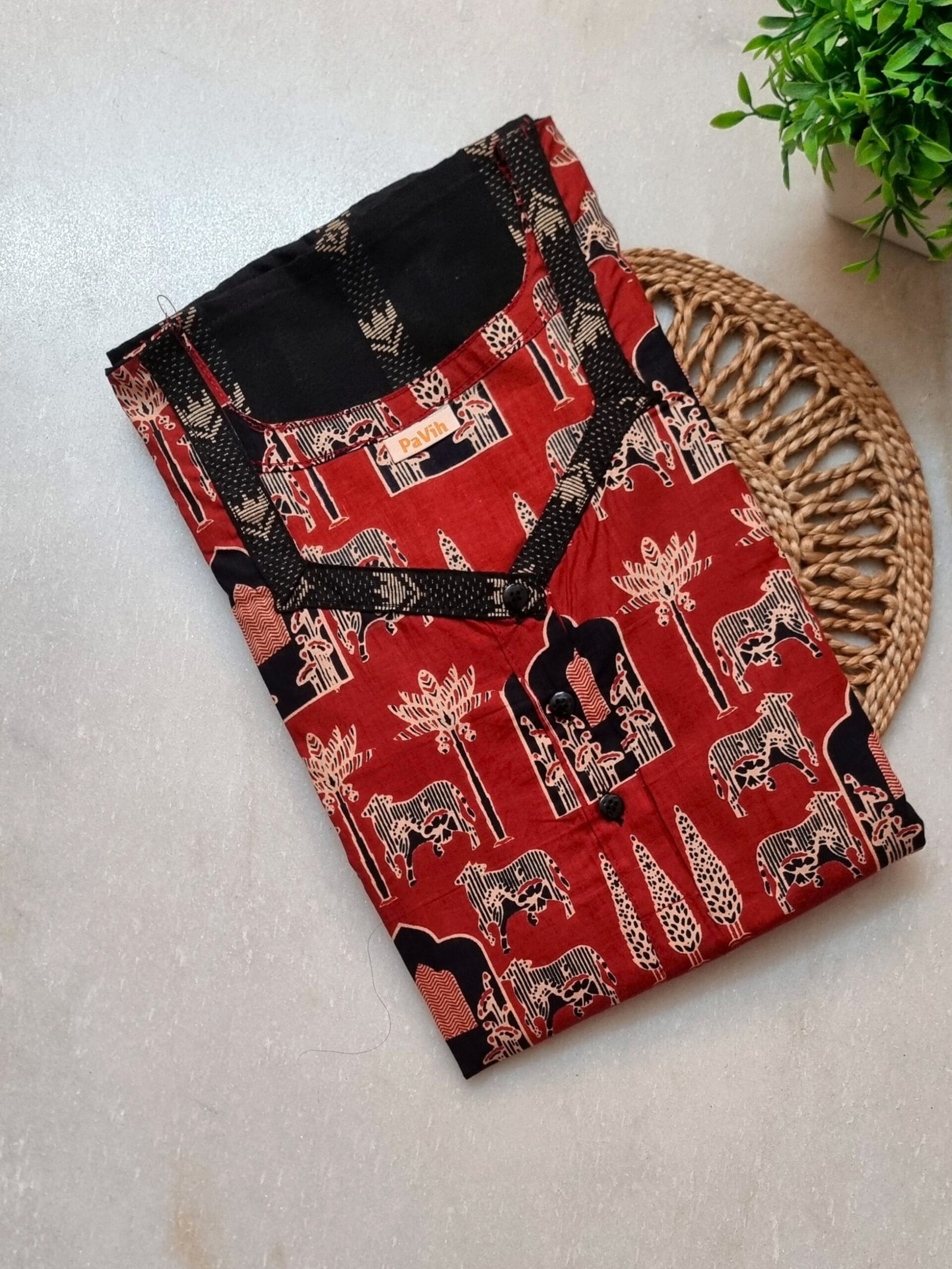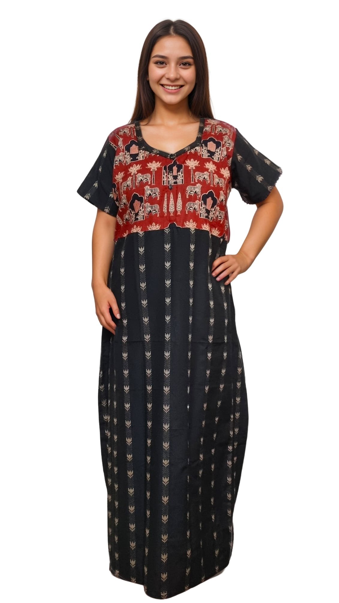 The striking half & half color combination of black and red creates a visually appealing contrast, enhanced with elegant printed patterns that add a designer finish. The flattering A-line silhouette offers a relaxed fit, allowing easy movement and all-night comfort without clinging to the body. Lightweight and airy, this cotton-blend nighty keeps you cool and comfortable whether you’re sleeping or lounging at home.