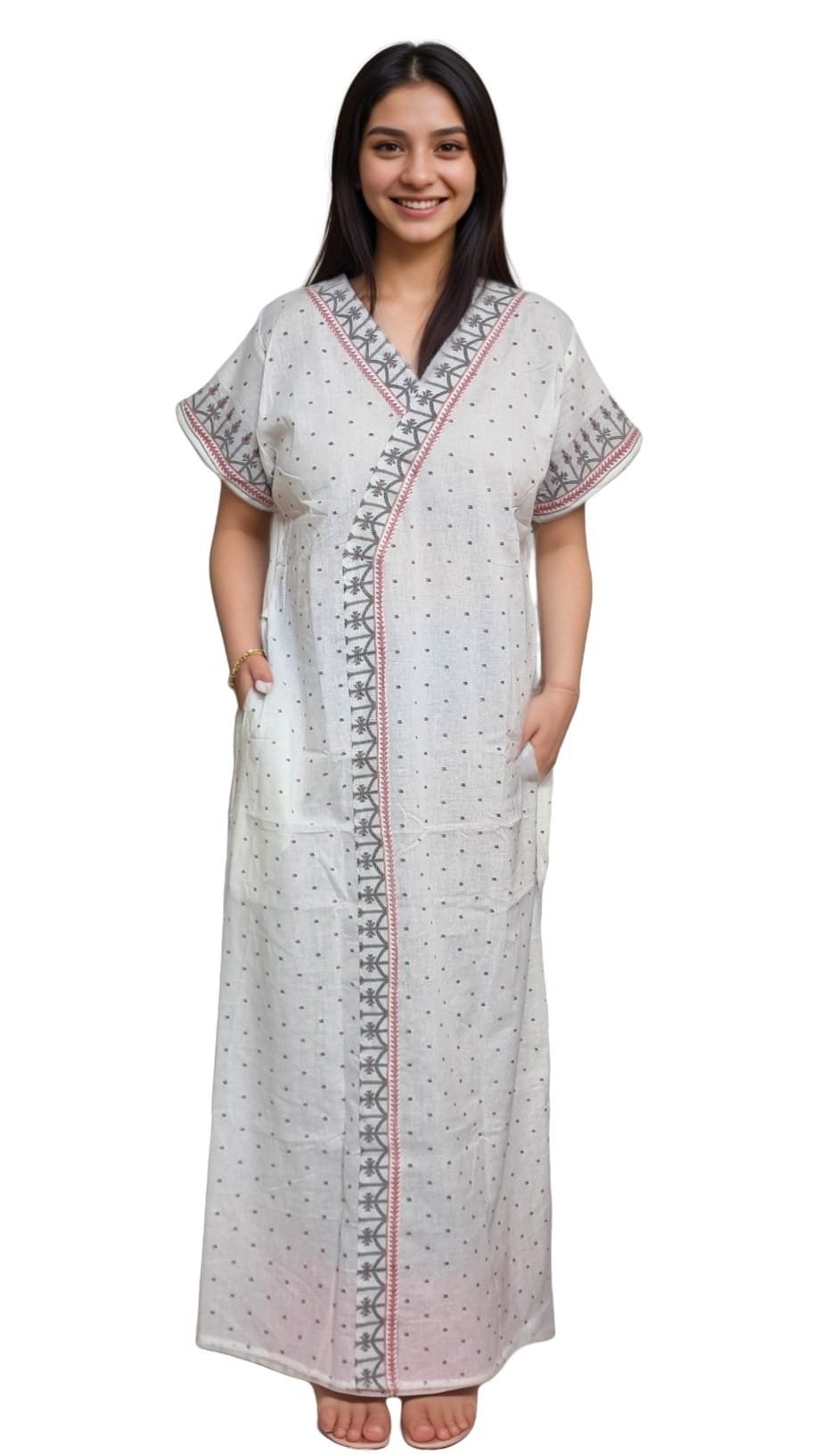 Made from lightweight mul cotton, this breathable cotton nighty for Indian weather keeps you cool and relaxed even during warm nights. The maxi length offers full coverage, making it a popular maxi nighty cotton choice for women looking for modest yet stylish women’s cotton nightwear. Designed as a free size cotton nighty 48 inch bust, it comfortably fits most body shapes.