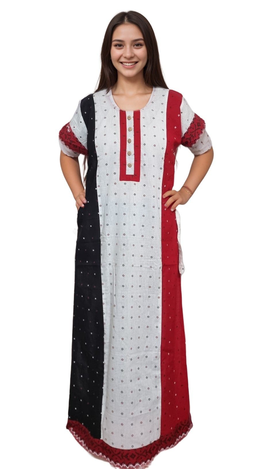 This A-line nighty for women features a flattering free-size fit that comfortably suits up to a 48-inch bust, making it perfect for everyday wear. The design showcases a stunning blend of ethnic-inspired prints, contrasting vertical panels, and delicate motifs, giving it a rich yet graceful look. The stylish front placket with decorative buttons enhances its designer appeal, while the round neckline and half sleeves ensure relaxed ease.